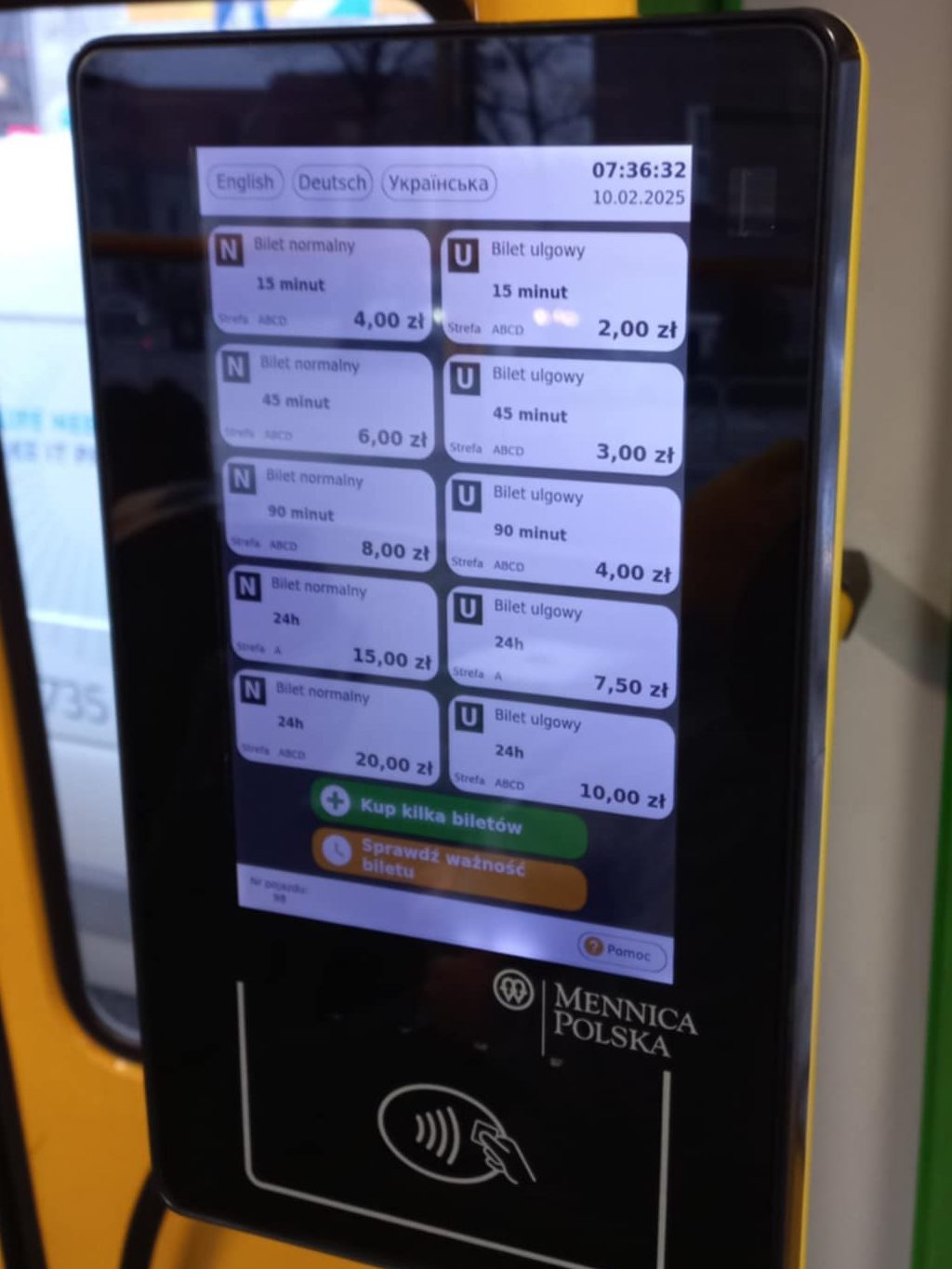 To buy tickets, you can use paper ticket machines (at the main stops) or applications such as JakDojade and Skycash. Additionally, you can use this device to buy tickets on most buses and trams using your payment card. Just select the ticket that will be linked to your payment card